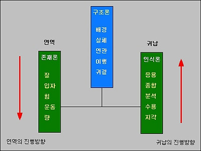 구조론은 ‘존재론’과 ‘인식론’으로 나누어지며 존재론은 존재의 순서와 방향을 나타내고, 인식론은 인식의 순서와 방향을 나타낸다. 둘은 정확히 반대된다. 존재론을 뒤집으면 인식론이 되고 인식론을 뒤집으면 존재론이 된다.