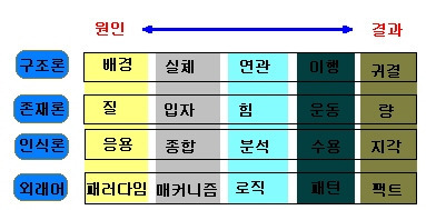 구조론은 ‘배경-실체-연관-이행-귀결’의 대표어 5개로 나타낼 수 있다. 존재론은 ‘질-입자-힘-운동-량’의 대표어 5개로 나타낼 수 있다. 인식론은 ‘지각-수용-분석-종합-응용’의 대표어 5개로 나타낼 수 있다.