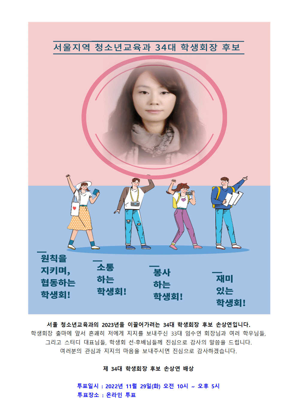 작성자이효숙(라온/청교/3) 작성시간 22.11.29 손상연 학생회장 후보님 응원하고 지지합니다. 화이팅입니다~^^