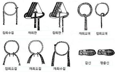 두건, 굴건, 수질(首絰), 요질(腰紩)은 참최는 삼노끈을 달고 꿰매어 묶은 자리가 왼쪽이고, 재최는 삼베끈을 달고 꿰매어 묶은 자리가 오른쪽이다.