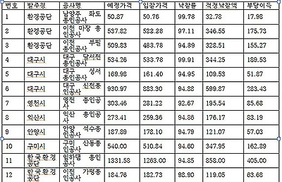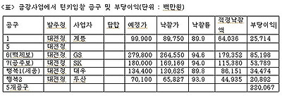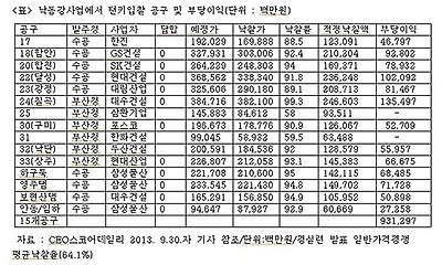 낙동강사업의 경우 턴키입찰 과정에서 경쟁이 이루어진 공구는 25공구와 31공구로 판단되고, 나머지 공구는 모두 담합이 이루어졌다고 판단된다. 그 근거는 경쟁이 이루어진 공구의 낙찰률은 약 60%에 이르지만, 나머지 공구의 낙찰률은 90%에 이른다는 점이다. 특히 24공구(칠곡보)의 경우 낙찰률이 99.3%에 이른다. 따라서 낙동강사업에서 턴키입찰 담합으로 건설사가 얻은 부당이득은 약 9313억 원으로 추정할 수 있다.