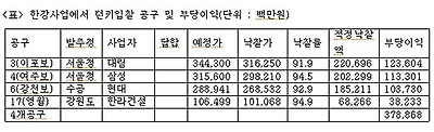 한강사업은 신규사업 17개 공구로 이루어져 있는데, 그중에서 일괄입찰 공구는 3공구(이포보), 4공구(여주보), 6공구(강천보), 17공구(영월저류지)와 같이 4개 공구이다. 나머지는 일반입찰로 사업이 진행되었다. 다음 표에서 알 수 있듯이 한강사업의 경우 턴키입찰 공구에서 건설사들이 3789억 원의 부당이득을 챙겼다고 추정된다.