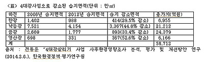 한편 한국환경정책·평가연구원이 발행한 '4대강 살리기 사업 사후환경영향조사 분석, 평가 및 개선방안 연구'(2014.2.6.)에 따르면 4대강 사업으로 감소한 습지면적은 다음 표와 같다. 1ha = 1만㎡이므로 감소된 습지에 대한 총 가치는 5조8712억 원에 이른다.