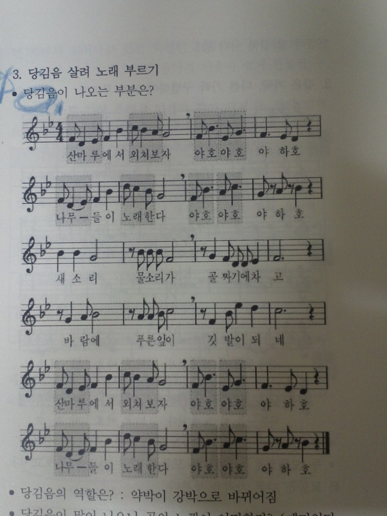 악보에서 보면 음표에 의한 당김음을 색칠해 놓고 있습니다.