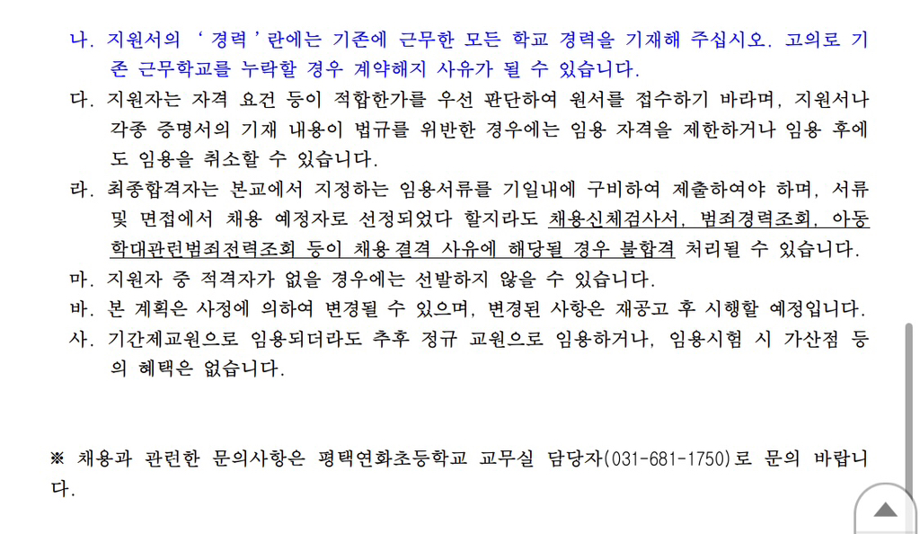 공고문을 읽어 보시고 본교에 기간제 교사로 지원하고자 하는 분께서는 댓글로 메일 주소를 적어 주시면 지원자 서류 양식 한글 파일을 이메일로 보내드리겠습니다.