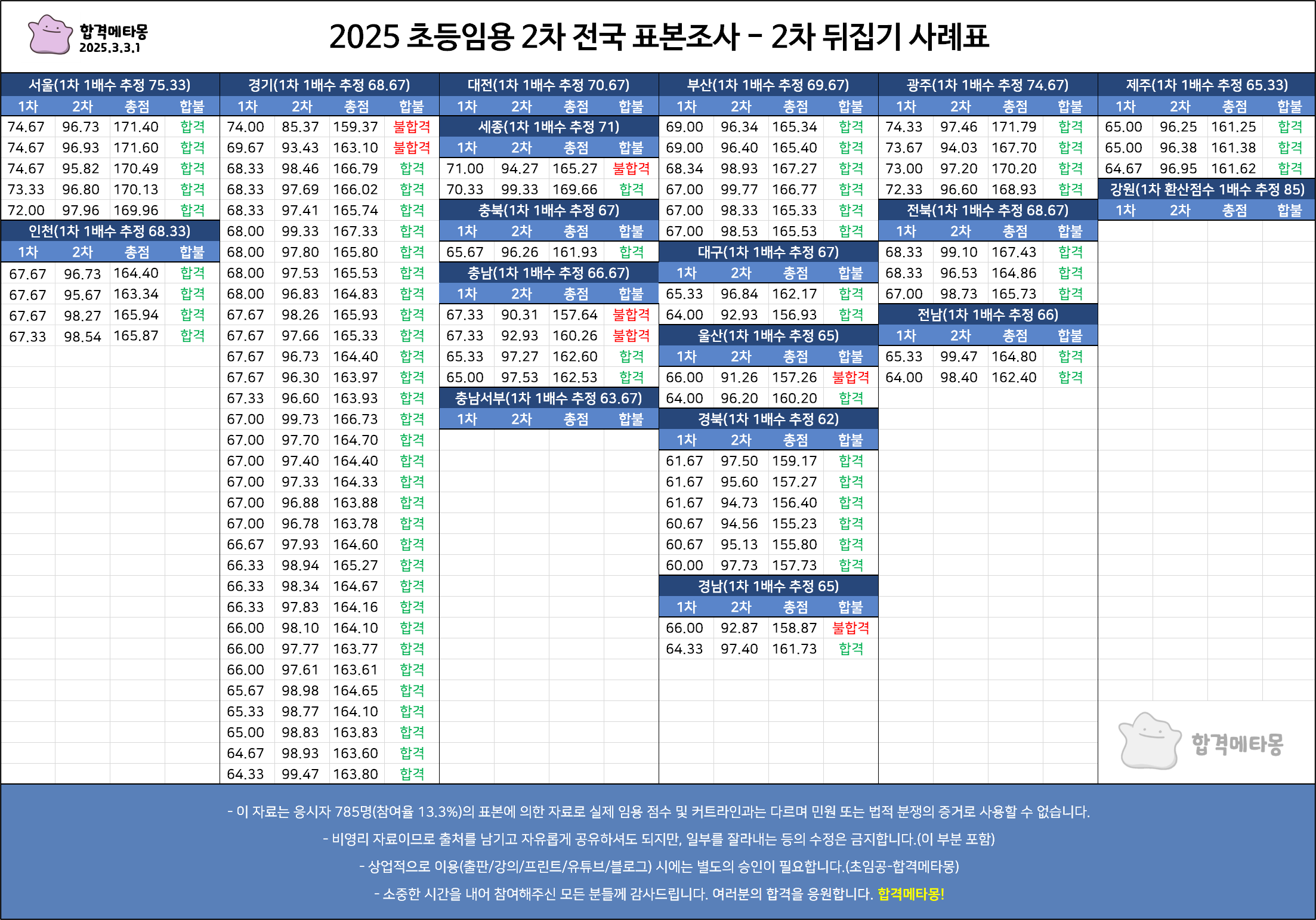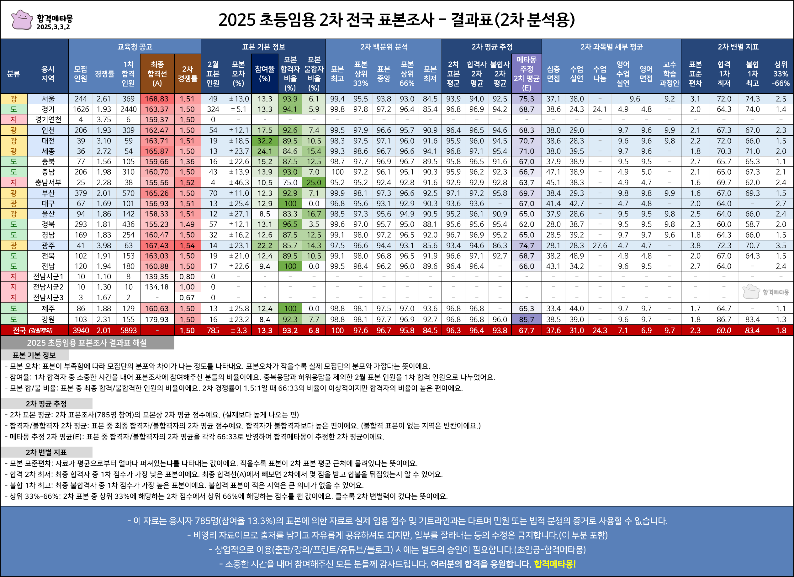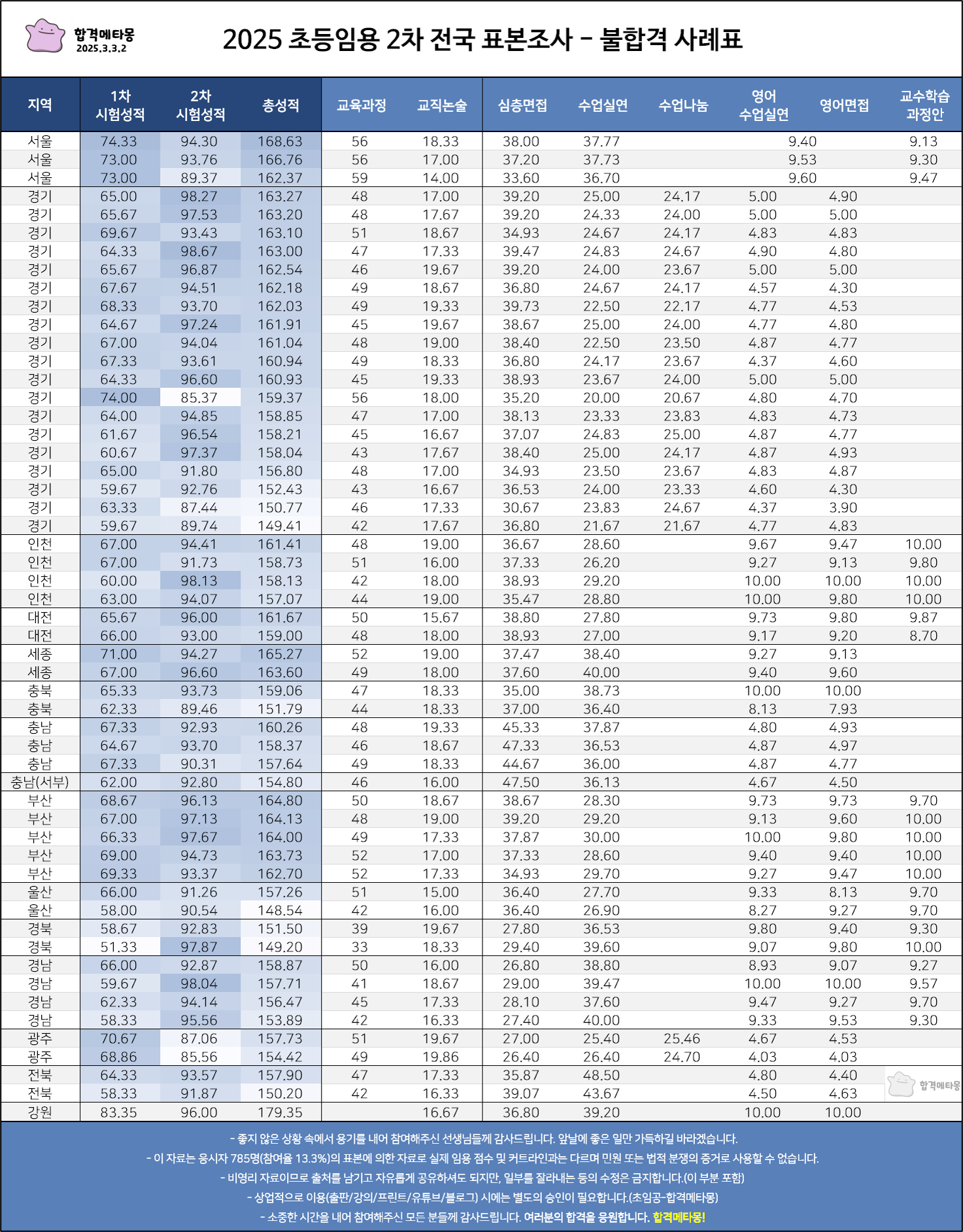 또한 대체로 불합격자의 2차 평균 점수가 합격자보다 낮은 편인데, 이번 조사에서는 불합격 표본이 많이 부족했어요.(결과표의 '표본 불합격 비율' 항목 참고)