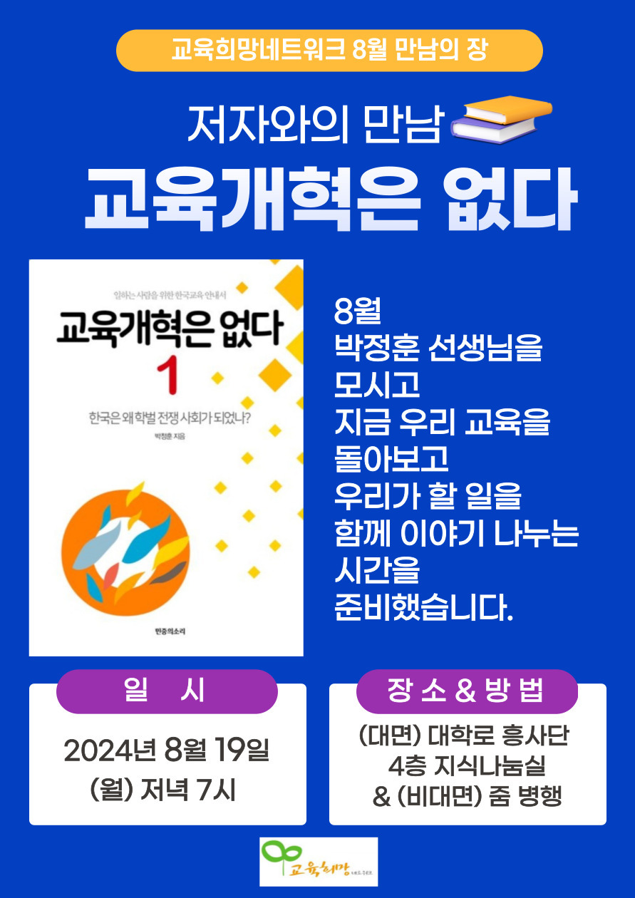 교육희망네트워크 8월 만남의 장으로 《교육개혁은 없다 1, 2》 책을 쓴 박정훈 선생님을 모시고 함께 이야기 나누는 시간을 준비했습니다. 저자와의 만남을 통해 지금 산적한 굵직한 교육 현안을 어떻게 바라보고 우리가 할 일은 무엇인지 같이 생각해볼 예정입니다. 회원 분들의 많은 관심과 참여를 기다립니다.
