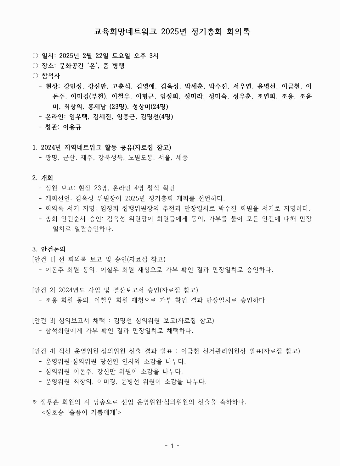2025년 정기총회 회의록 작성자교육희망넷|작성시간25.03.18|조회수37 목록 댓글 0 글자크기 작게가 글자크기 크게가 교육희망네트워크 2025년 정기총회 회의록_20250222.pdf70.29KB 첨부파일첨부된 파일이 3개 있습니다. jpg 파일 2025년 정기총회 회의록(1).jpg 다운로드 jpg 파일 2025년 정기총회 회의록(2).jpg 다운로드 pdf 파일 교육희망네트워크 2025년 정기총회 회의록_20250222.pdf 다운로드 다음검색 현재 게시글 추가 기능 열기 북마크 공유하기 신고 센터로 신고 댓글 댓글 0 댓글쓰기 답글쓰기 댓글 리스트
