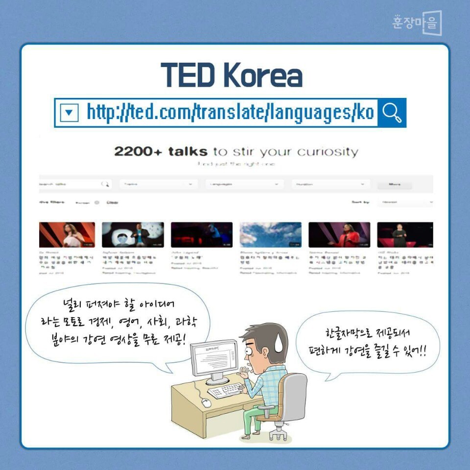 저는 테드 강의 되게 많이들어요. 아예 어플리케이션으로 따로 받아서 듣는데 재밌어요.