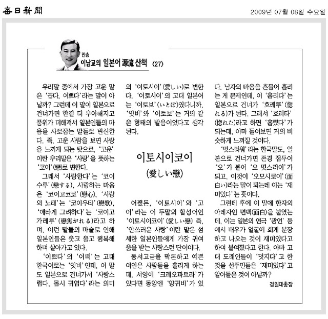 [이남교의 일본어 源流 산책] 이토시이코이 작성자아토*|작성시간10.04.14|조회수373 목록 댓글 0 글자크기 작게가 글자크기 크게가 다음검색 현재 게시글 추가 기능 열기 북마크 공유하기 신고 센터로 신고 댓글 댓글 0 댓글쓰기 답글쓰기 댓글 리스트