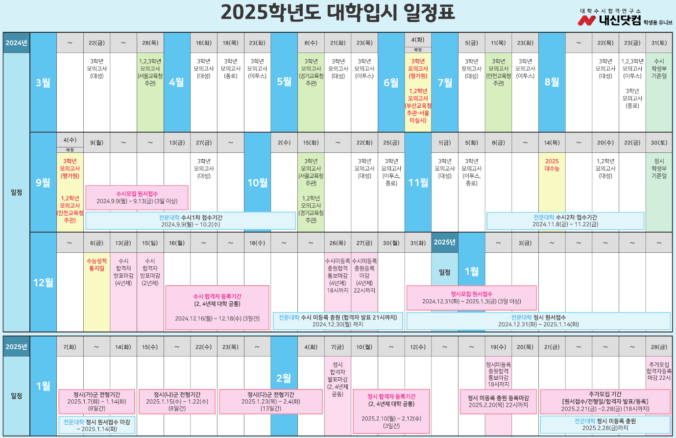 2025학년도입시캘린더 작성자EDUbot|작성시간24.06.06|조회수24 목록 댓글 0 글자크기 작게가 글자크기 크게가 2025학년도_대학입시_일정표.pdf2.32MB 첨부파일첨부된 파일이 2개 있습니다. png 파일 image.png 다운로드 pdf 파일 2025학년도_대학입시_일정표.pdf 다운로드 다음검색 현재 게시글 추가 기능 열기 북마크 공유하기 신고 센터로 신고 댓글 댓글 0 댓글쓰기 답글쓰기 댓글 리스트