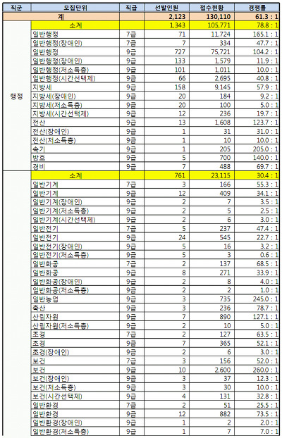 서울지방공무원 임용시험 원서접수 결과 총 2,123명을 선발하는 채용 시험에 13만 110명이 응시해 61.3대 1의 경쟁률을 보였습니다.