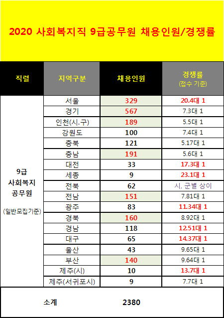 올해 2020년 9급 사회복지공무원 지역별 선발인원 및 경쟁률을
