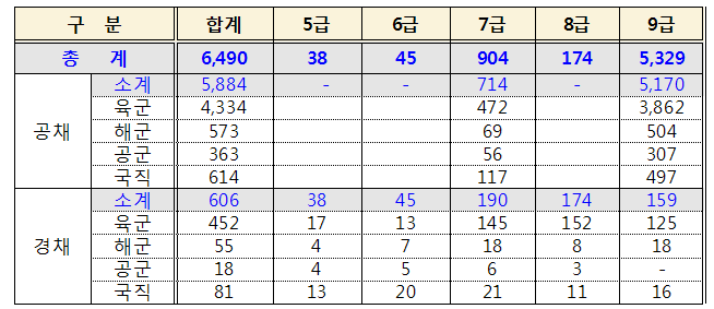 올해는 군무원 정규시험을 통하여 총 6,490명을 선발하며 공개경쟁채용 5,884명, 경력경쟁채용 606명을 채용할 예정입니다.