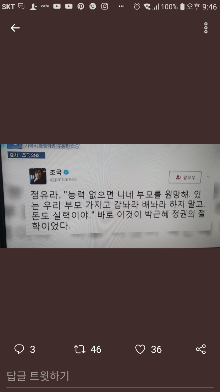 “의전원과 외고를 애 혼자서 알아서 갔다고 생각하는것도.. 청순하신 겁니다. 그 당시.. 의전원이며 외고며 사교육으로 점철해야 다닐 수 있는 거예요. 설마 의전원이나 그 당시 외고가 한달에 30만원짜리 학원을 한두 개 다녀서 들어갈 수 있다 생각하시는건 아니죠? 자기자식은 사교육 받을만큼 받아 엘리트 코스 넣었으면서, 일반 국민들은 공부따윈 필요없다고 행복하게만 살라고 하는건 뭔가요?”
