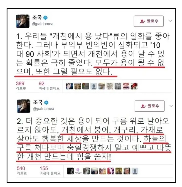 조국씨가 한 때 붕어 개구리 론을 펴면서 기득권층(용)과 서민대중(개천의 생물)의 고착화를 두둔하면서