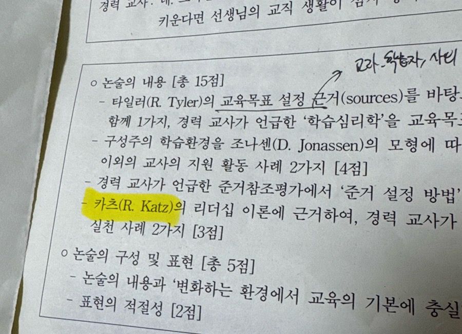 교육학은 교육학 이론들과 단계명, 적용방법과 사례적기 정도의 암기 문제들이 출제됩니다. 1문제라고 적혀있지만 새끼문제 4개짜리로, 배점은 4443에 기본점수 5점으로 인지하시면 됩니다. 과락은 8점입니다