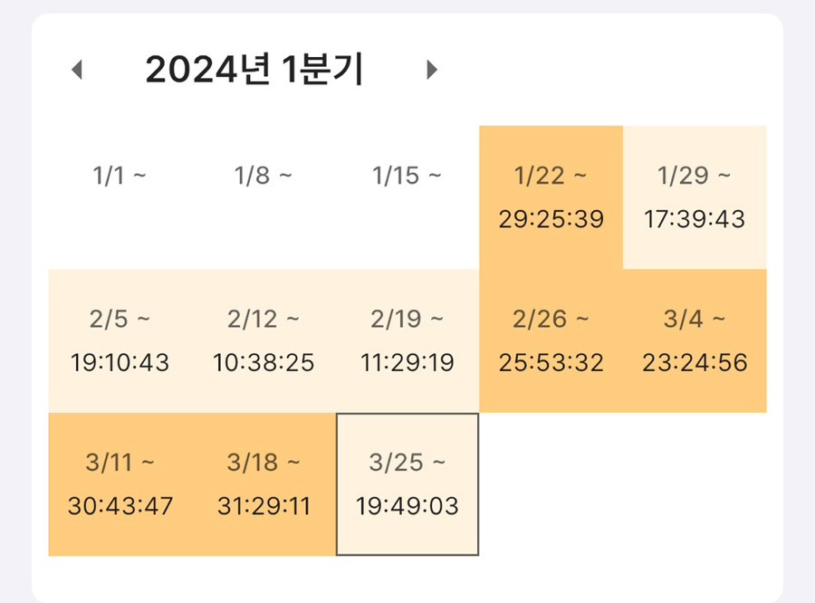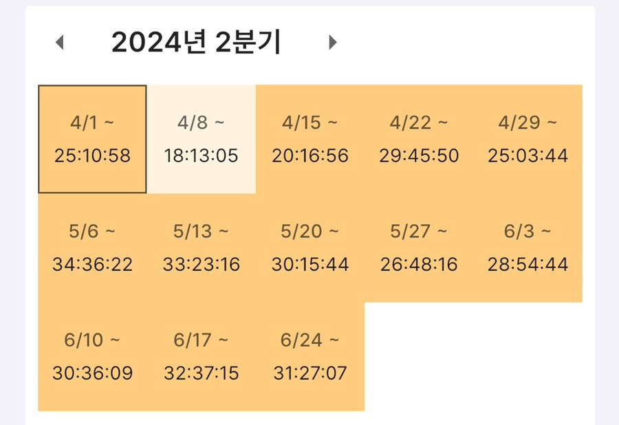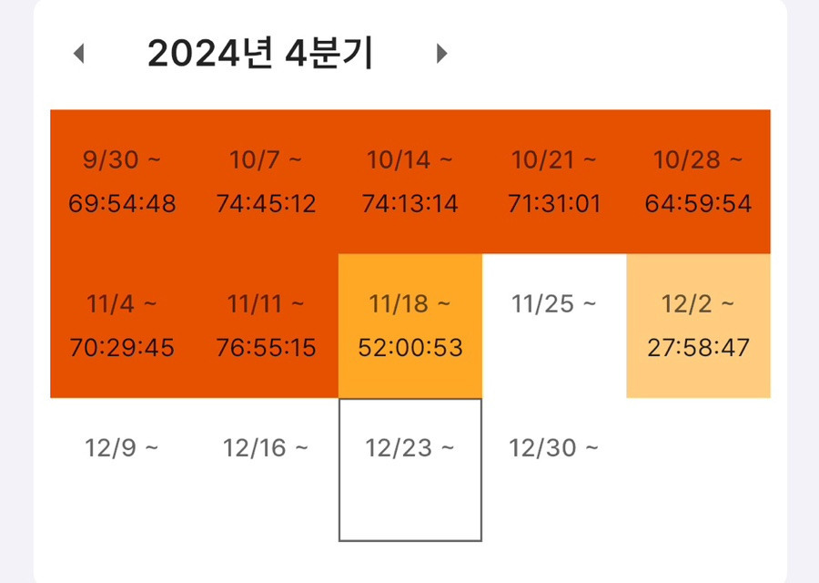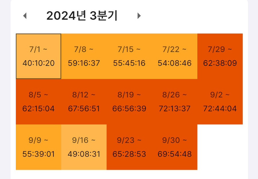이때부터 슬슬 색이 다르죠? 7월 3일부터 9월 초까지 거의 주당 65+h 페이스로 달렸습니다. 이후 잠시 쿨타임을 가지고 다시 9월 말 모의고사부터 달립니다.