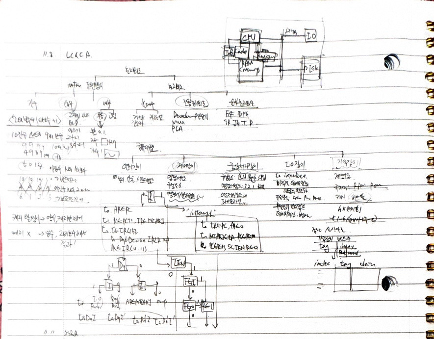 컴퓨터구조 역시 상당히 어려운 과목인 게 분명합니다. 저는 연산장치/제어장치/중앙처리장치/IO장치/기억장치로 분류하고 다 백지 방식으로 암기했습니다. 특히 명령어와 인터럽트 사이클, 8비트 가감산기와 캐시매핑은 20년동안 기억날 것 같았습니다(근데 지금보니까 기억안남)
