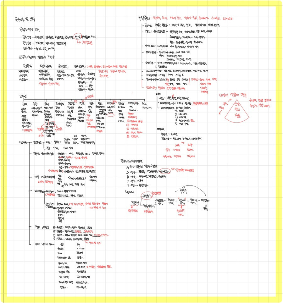 아까 사진 일부를 확대한 부분입니다. 검은색은 제가 백지로 최대한 뽑아낸 부분, 빨간색은 진짜 더 뽑다가 뇌가 마른오징어가 될거같다 싶을 때 그만 하고 기본서와 비교한 부분입니다. 이렇게 최대한 인출 -> 기본서와 비교 후 방금 쓴 백지에 보충 을 하면 1과목이 끝난겁니다.
