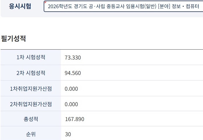 교과교육학은 공부를 시작하지 않은 상태이므로 내용학만 풀고 채점한 결과 (교교론은 모두 오답 처리) 32점이었습니다.