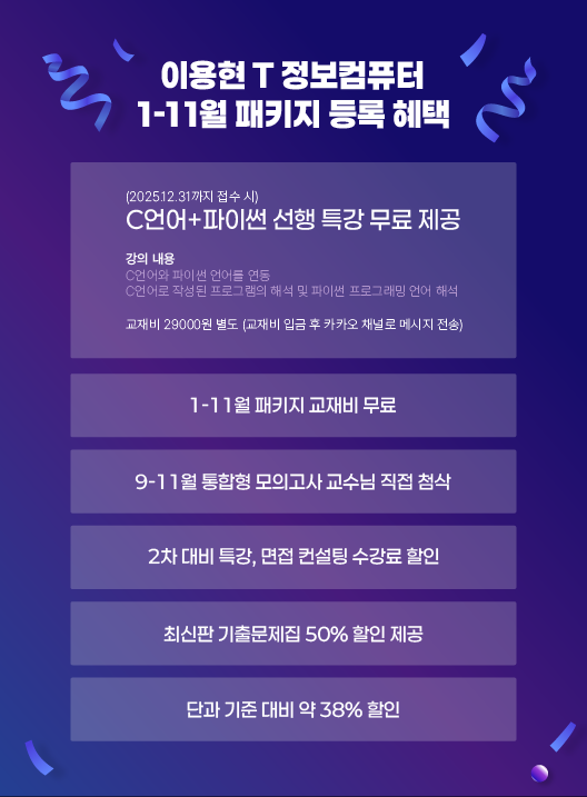 2027년대비 이용현 정보컴퓨터1-11월 패키지 수강시 (12월이벤트) 작성자정컴|작성시간25.12.02|조회수326 목록 댓글 0 글자크기 작게가 글자크기 크게가 다음검색 현재 게시글 추가 기능 열기 북마크 공유하기 신고 센터로 신고 댓글 댓글 0 댓글쓰기 답글쓰기 댓글 리스트
