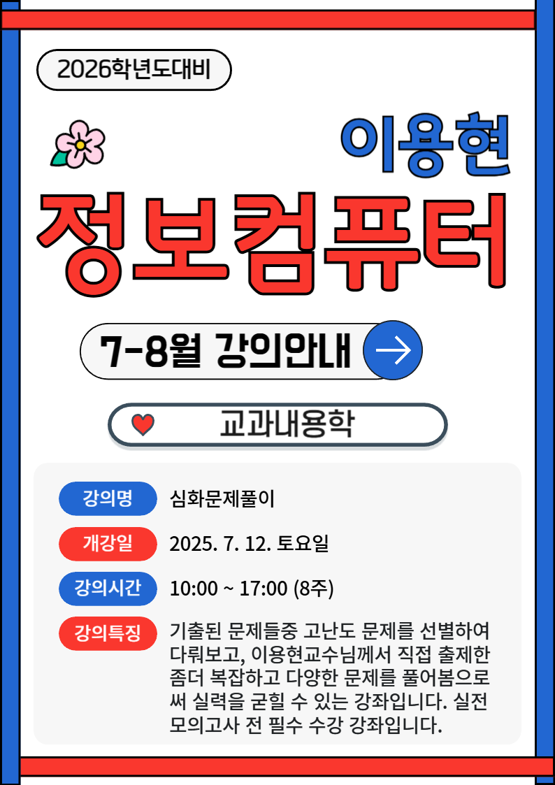 2026년도대비 정보컴퓨터 교과내용학 7-8월 강의 안내 작성자정컴|작성시간25.06.07|조회수332 목록 댓글 0 글자크기 작게가 글자크기 크게가 다음검색 현재 게시글 추가 기능 열기 북마크 공유하기 신고 센터로 신고 댓글 댓글 0 댓글쓰기 답글쓰기 댓글 리스트