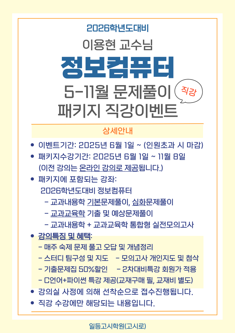 2026년대비 정보컴퓨터 직강 이벤트 작성자정컴|작성시간25.06.10|조회수364 목록 댓글 0 글자크기 작게가 글자크기 크게가 다음검색 현재 게시글 추가 기능 열기 북마크 공유하기 신고 센터로 신고 댓글 댓글 0 댓글쓰기 답글쓰기 댓글 리스트