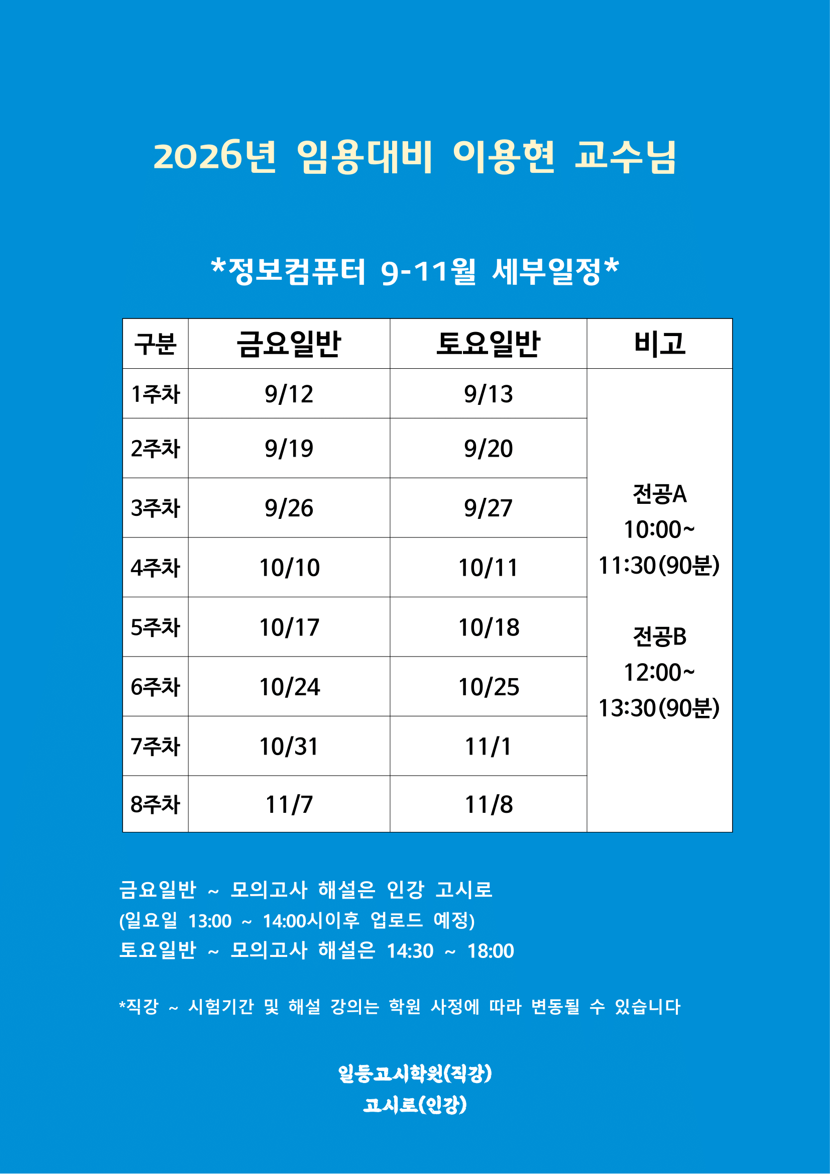 2026년 임용대비 이용현교수님 9-11월 세부일정 안내 작성자정컴|작성시간25.07.30|조회수288 목록 댓글 0 글자크기 작게가 글자크기 크게가 다음검색 현재 게시글 추가 기능 열기 북마크 공유하기 신고 센터로 신고 댓글 댓글 0 댓글쓰기 답글쓰기 댓글 리스트