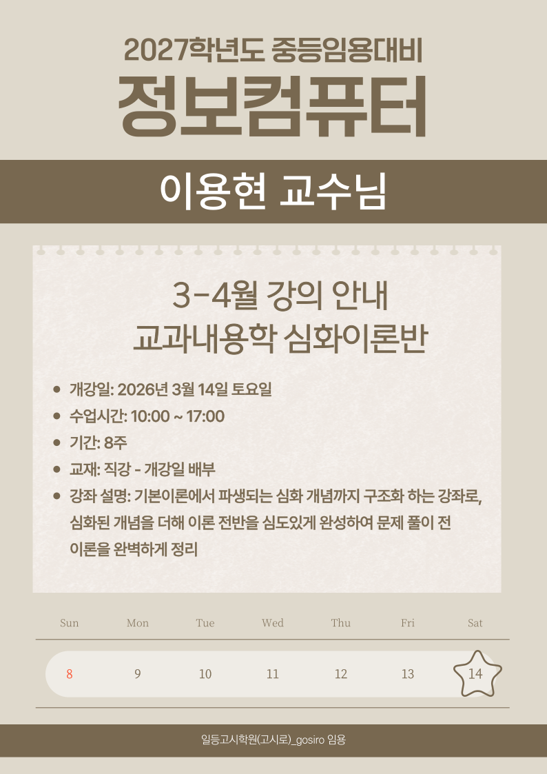 2027년대비 이용현정보컴퓨터(교과내용학) 심화이론 강의안내 작성자정컴|작성시간26.02.11|조회수386 목록 댓글 0 글자크기 작게가 글자크기 크게가 다음검색 현재 게시글 추가 기능 열기 북마크 공유하기 신고 센터로 신고 댓글 댓글 0 댓글쓰기 답글쓰기 댓글 리스트