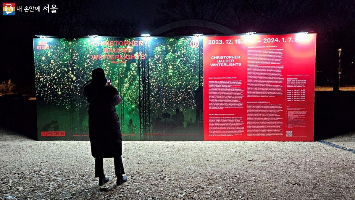 금세 손이 시렸다. 종종걸음으로 서울숲 가족마당으로 향했다. 서울숲에서 처음으로 시도되는 ‘움직이는 예술공원’의 첫 프로그램 ‘겨울빛, 윈터라이트(WINTERLIGHTS)’를 찾아가는 길이었다. 어둑해진 서울숲 가족마당에 ‘겨울빛, 윈터라이트’ 안내판이 세워져 있었다. 멋진 포스터를 배경으로 시민들이 사진을 찍는 모습도 볼 수 있었다. 추운 밤, 불빛 속의 안내판이 따뜻해 보였다. ☞ [관련 기사] 알찬 방학을 위해 일단 저장각! 서울 공원 겨울 프로그램