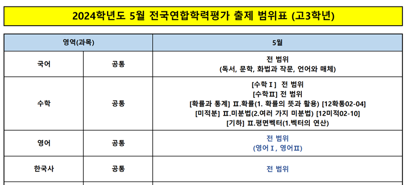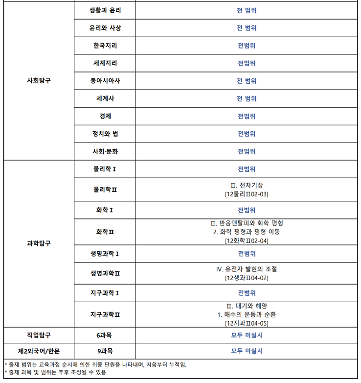 4) 3월에 없던 과학탐구의 물리학.화학.생명과학.지구과학의 Ⅱ과목의 출제가 있고 부분 범위이다.