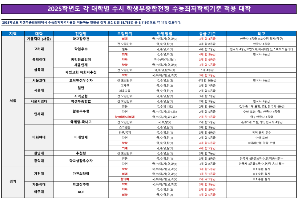 <2025학년도 수시 모집중 학생부 종합전형 수능최저 기준 요구 대학 현황>