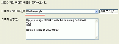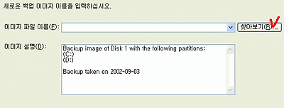 5. 백업하게될 드라이브를 찾아보기 버튼을 클릭하시어 선택하시고 이미지 파일 이름에 적당한 이름을 입력하세요 D:\를 선택해서 image를 입력하도록 하겠습니다.