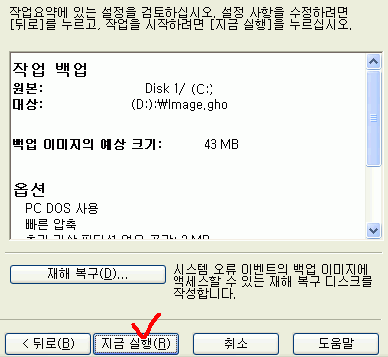 10. 지금껏 설정했던 작업들의 내용이 올바른 것인지 확인하시고 지금 실행버튼을 클릭하시면 몇분만에 윈도우의 백업 작업이 실행되게 됩니다.