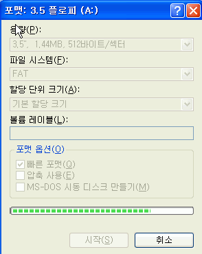 19. 플로피 디스켓을 A드라이브에 넣으시고 빠른 포맷이 선택된 상태로 다음 작업을 진행하세요.