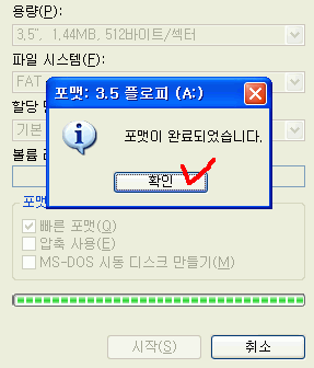 25. 포맷이 끝났으니 닫기 버튼을 클릭하세요. (만일 USB 장치를 지원하는 부팅디스켓을 만들게 되면 부팅디스켓을 한장 더 준비하여 마법사의 지시에 따르면 됩니다.)