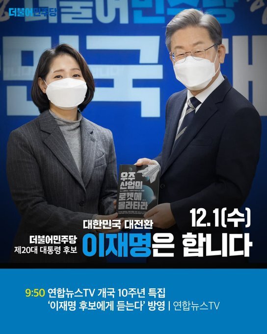 12/1일(수) 더불어민주당 이재명 대통령 후보일정 작성자junghwan|작성시간21.11.30|조회수267 목록 댓글 4 글자크기 작게가 글자크기 크게가 *이재명 대통령 후보- 09:40 연합뉴스TV 개국 10주년 특집 <이재명 후보에게 듣는다> 방영 다음검색 현재 게시글 추가 기능 열기 북마크 공유하기 신고 센터로 신고 댓글 댓글 4 댓글쓰기 답글쓰기 댓글 리스트 작성자바른세상 | 작성시간 21.12.01 방송을 밤에 해야 많이 보는데 좀 아쉽네요 작성자Teresa | 작성시간 21.12.01 연합뉴스 TV의 채널번호는 23번입니다. 작성자진실수호 | 작성시간 21.12.01 오늘도 우리 후보님 파이팅입니다~ 작성자김 선숙 | 작성시간 21.12.01 이재명대통령 후보님 끝까지 응원합니다 댓글 전체보기