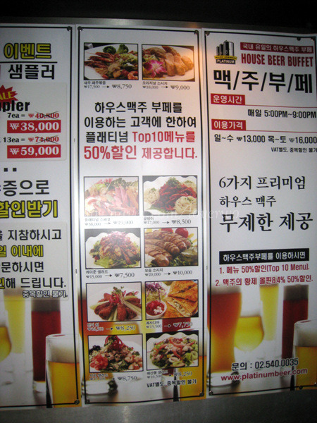 또한 플래티넘비어의 굉장한 매력중의 하나가 맥주부페를 신청하게 되면 대부분의 안주를 50% 가격으로 먹을 수 있다는 거예여...
