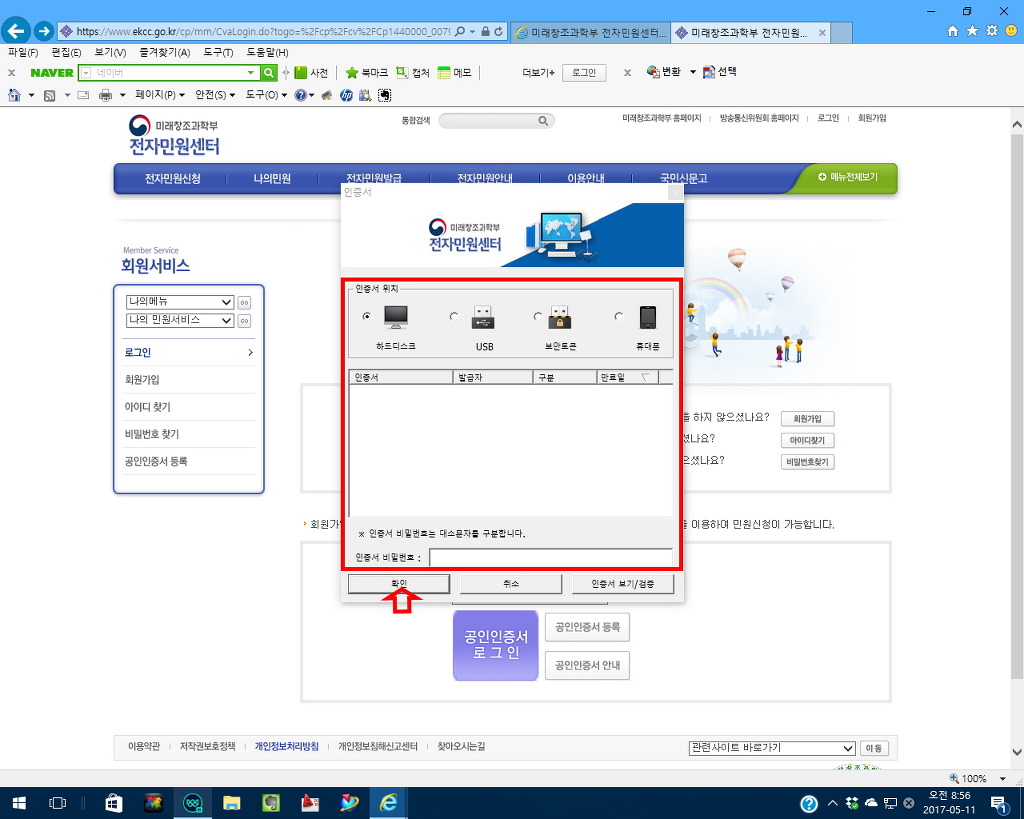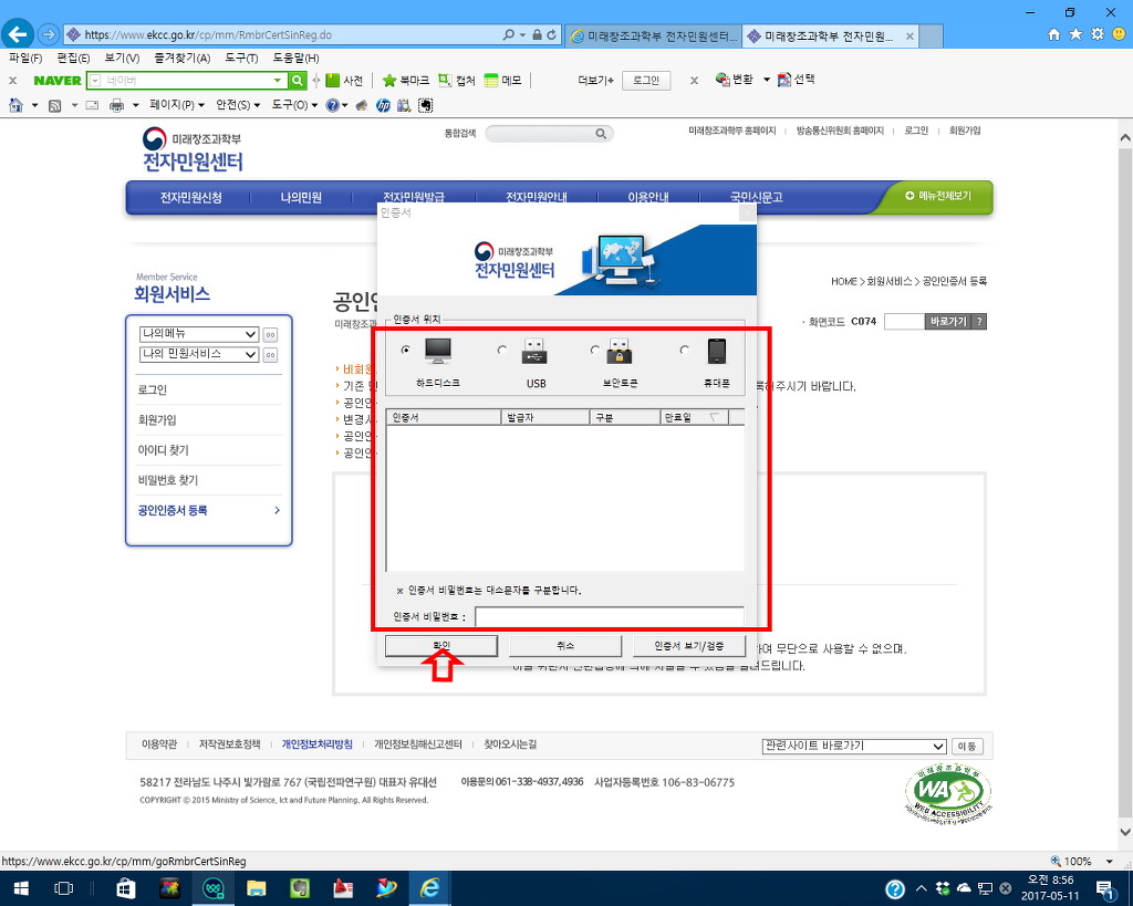 공인인증서를 선택하고 비밀번호를 입력한 후 확인을 클릭....