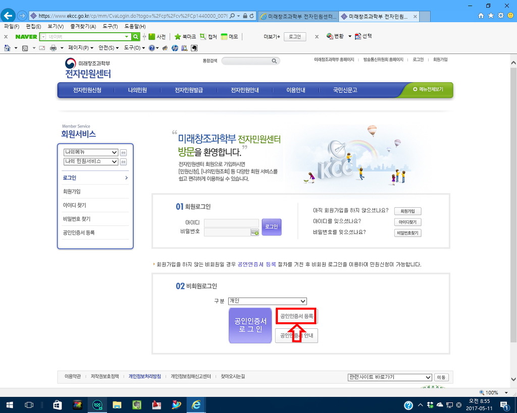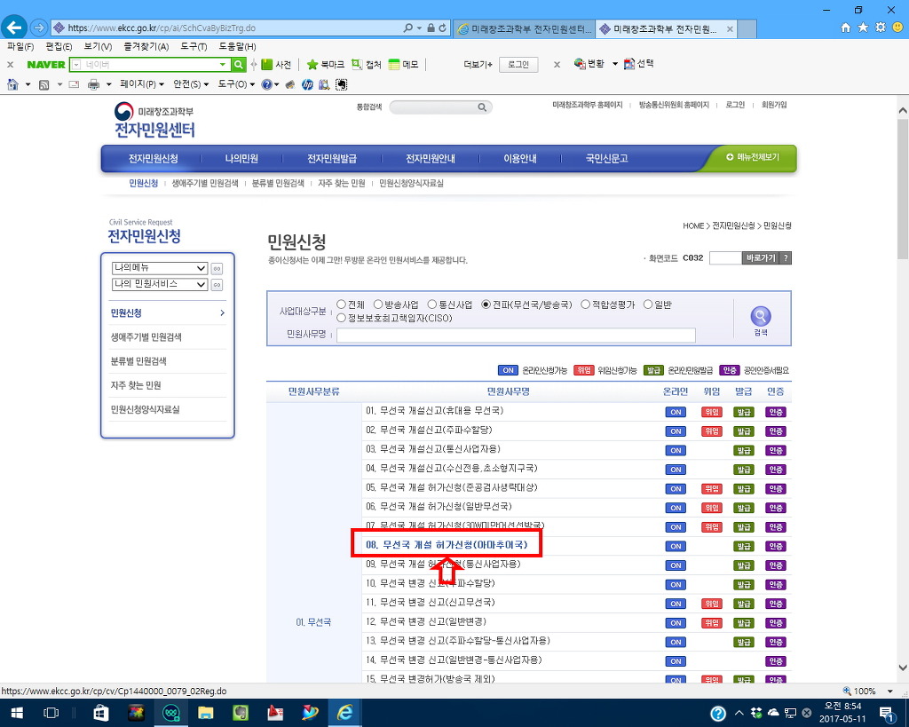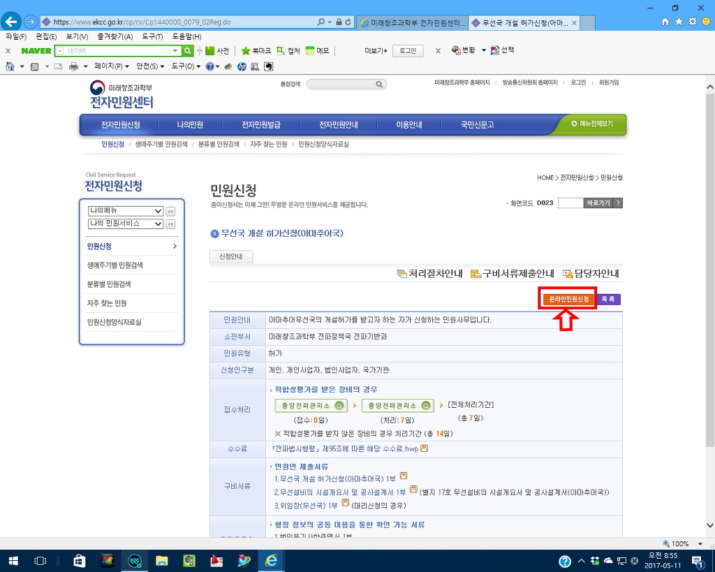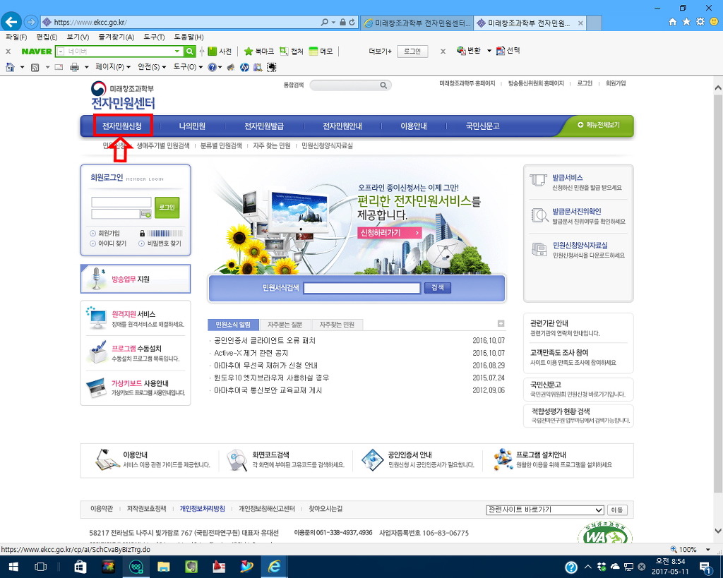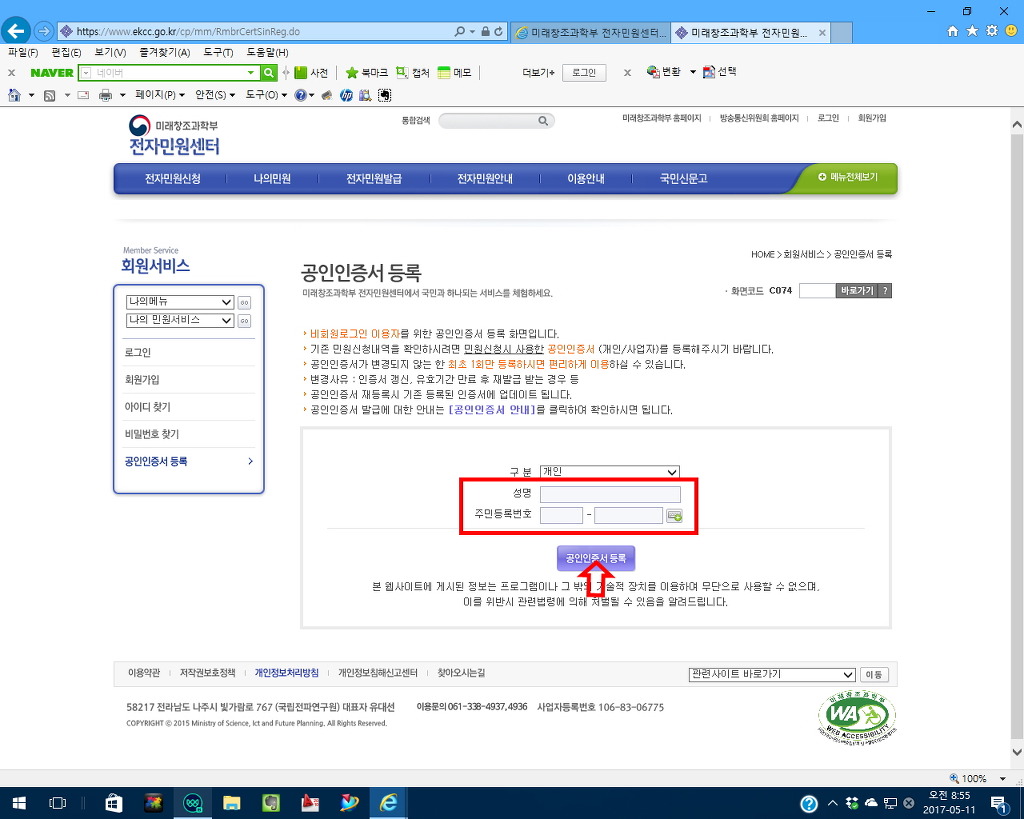 공인인증서를 준비하신 후 인터넷에서 미래창조과학부 전자민원센터를 검색하신 후 클릭....