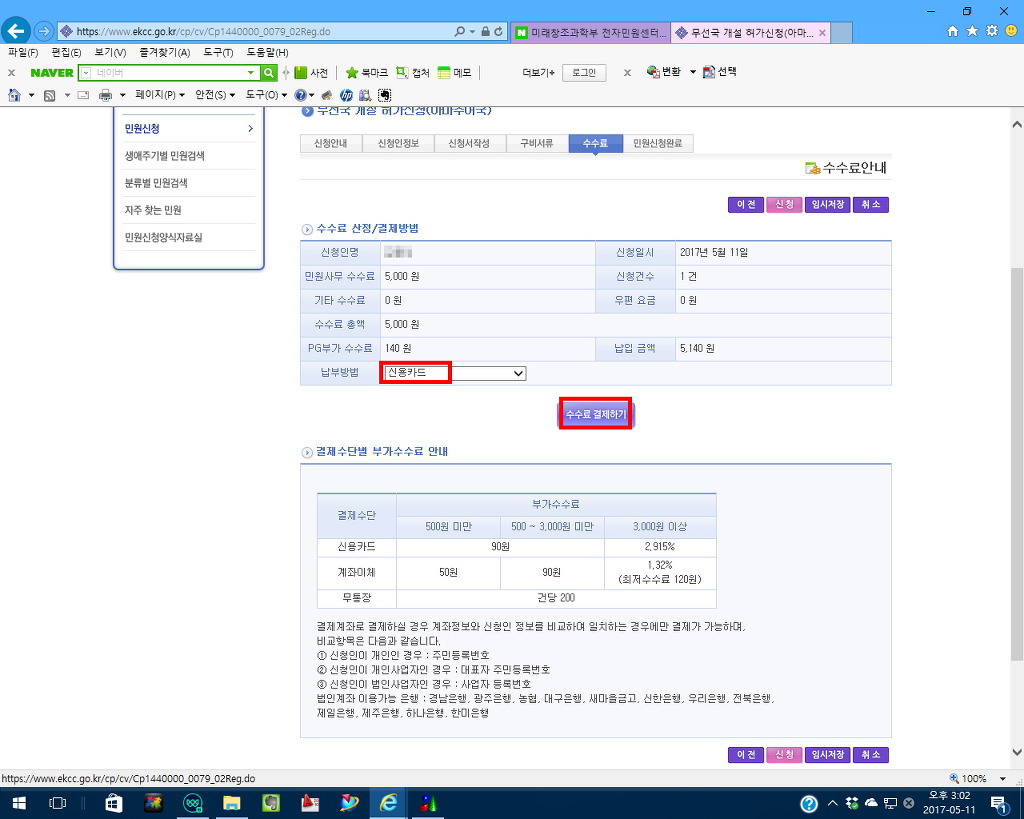 원하시는 결제방법을 선택하신 후 수수료결제하기를 클릭...