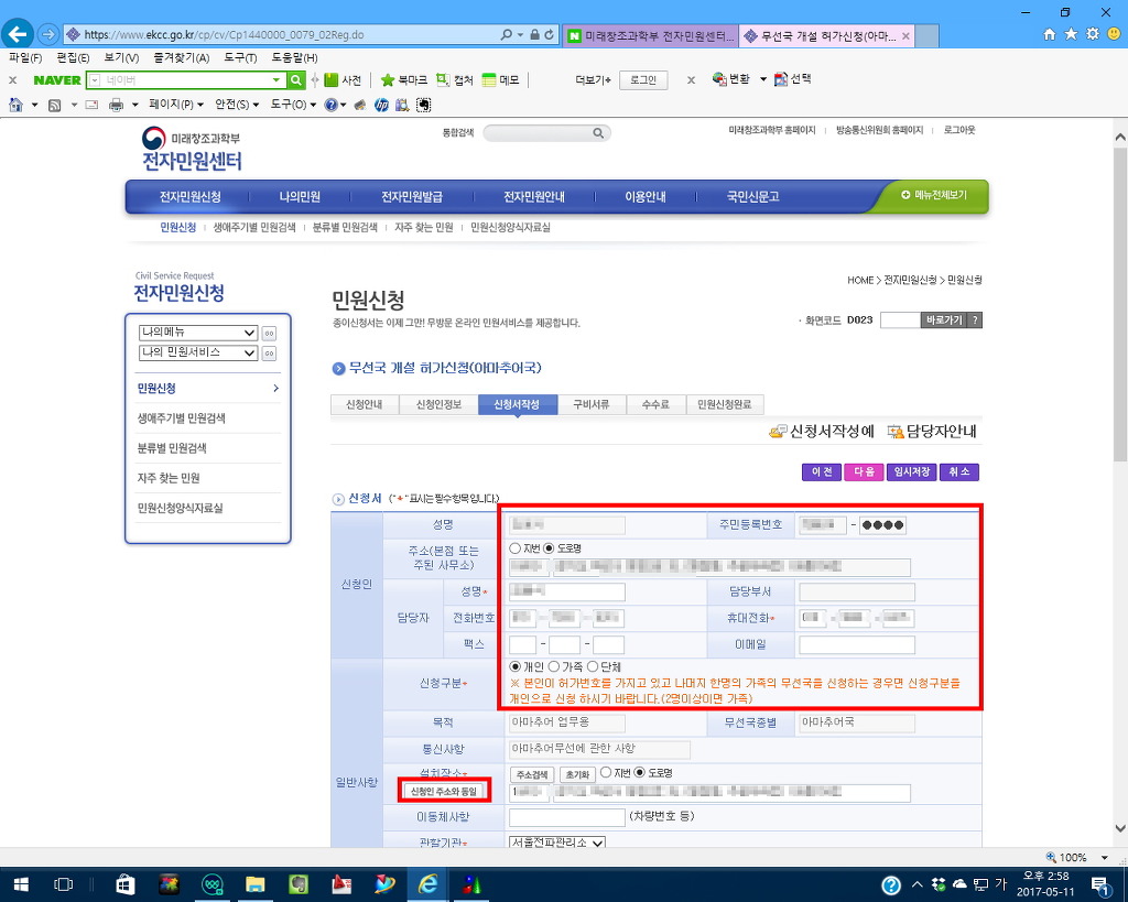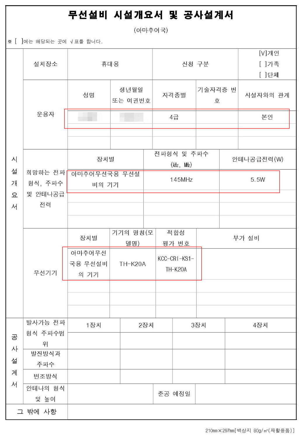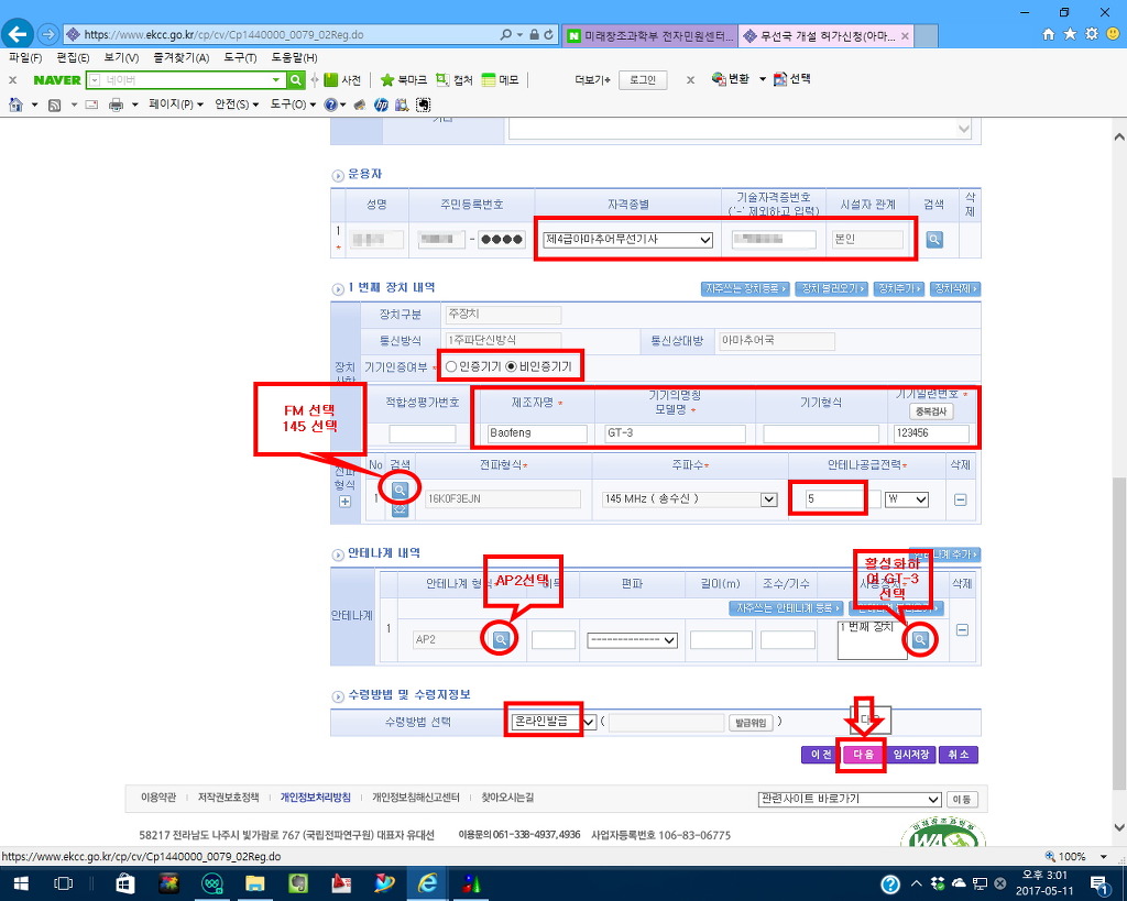먼저 준비하셔야하는게 ①공인인증서 ②무전기의 제조자, 모델명, 일련(제조)번호 ③무전기의 전파 인증서 (국내전파인증을 받은 경우만) ④무선설비 시설개요서 및 공사설계서 (첨부파일 다운받아 작성하세요)