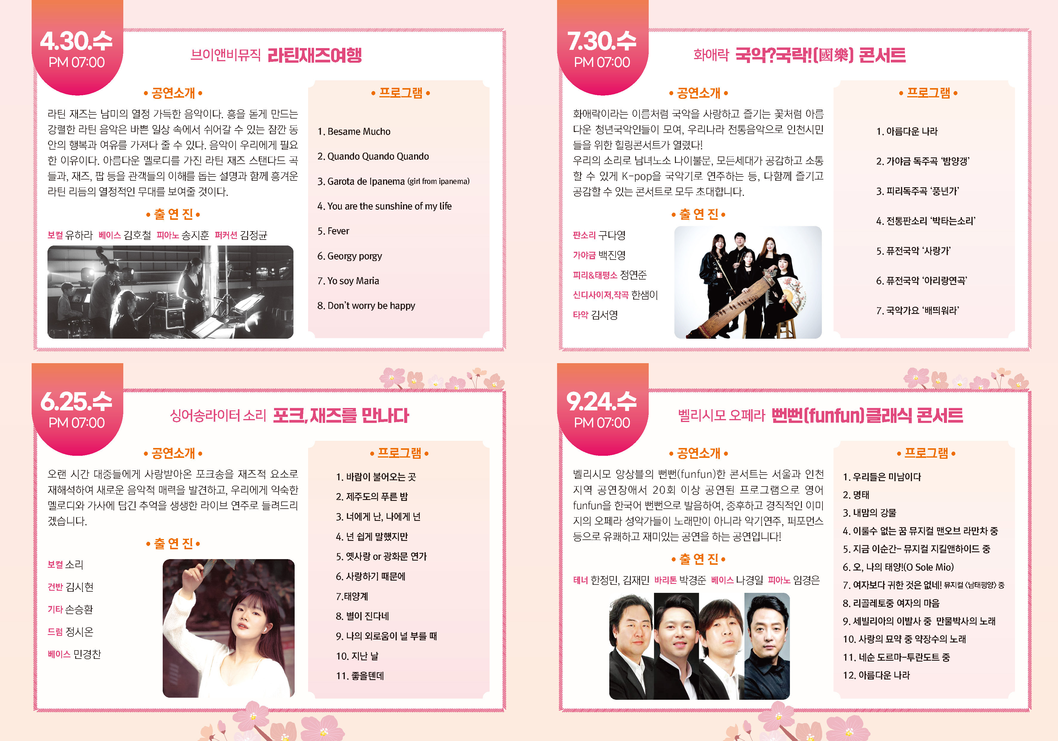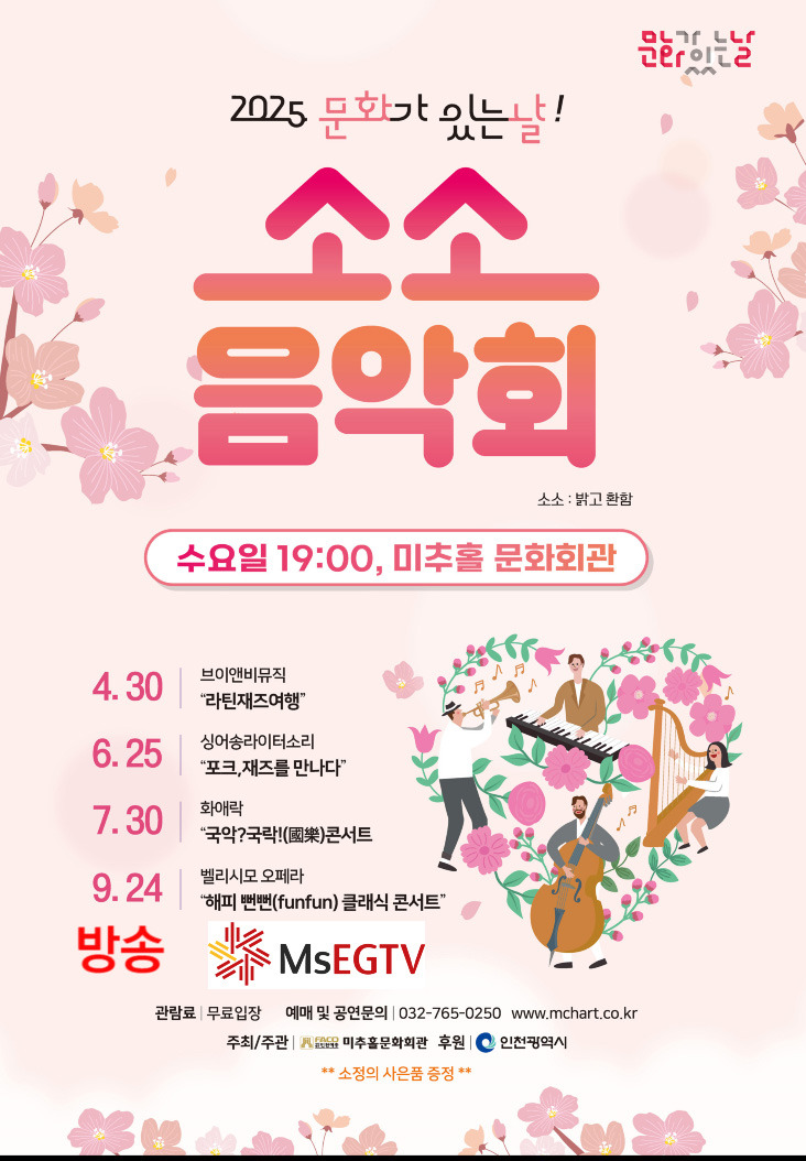 2025 문화가 있는 날! 소소 음악회, 인천 미추홀문화회관, MsEGTV 작성자MsEGTV|작성시간25.03.27|조회수8 목록 댓글 0 글자크기 작게가 글자크기 크게가 다음검색 현재 게시글 추가 기능 열기 북마크 공유하기 신고 센터로 신고 댓글 댓글 0 댓글쓰기 답글쓰기 댓글 리스트