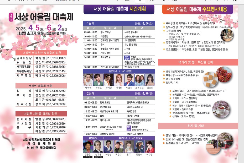 제2회 서상 어울림 대축제, 제12회 서상 남덕유산 벚꽃축제, 제62회 면민 체육대회, 제53회 어버의 날 위안 행사, MsEGTV 작성자MsEGTV|작성시간25.03.27|조회수12 목록 댓글 0 글자크기 작게가 글자크기 크게가 다음검색 현재 게시글 추가 기능 열기 북마크 공유하기 신고 센터로 신고 댓글 댓글 0 댓글쓰기 답글쓰기 댓글 리스트