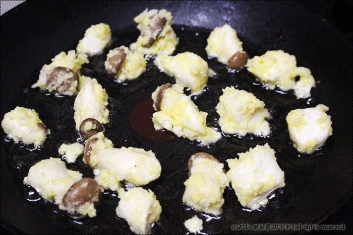 약불로 줄여서 빵가루 옷 입힌 꼬마새송이버섯 넣고..
