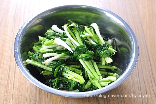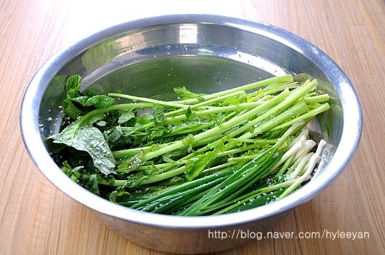부드럽게 절여진 쪽파와 갓은 헹구지말고 물기만 쭉 빼서