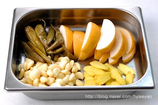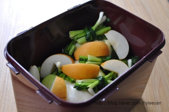 갓, 쪽파 묶은것, 배, 삭힌고추를 김치통에 골고루 담아요.