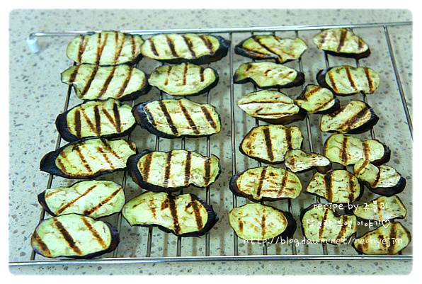 구운 가지를 채반에 올려 식혀야 수분이 날아가서 식감이 쫄깃해져요.