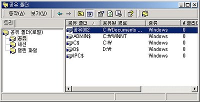 이 [공유 폴더] 창에서 공유되어 있는 목록을 확인할 수 있습니다. (공유폴더 이름에 $가 붙어 있는 폴더는 "관리목적 공유폴더"라는 특수한 공유폴더입니다. 이 폴더에 대해서는 여기에서 자세한 설명을 보실 수 있습니다.)